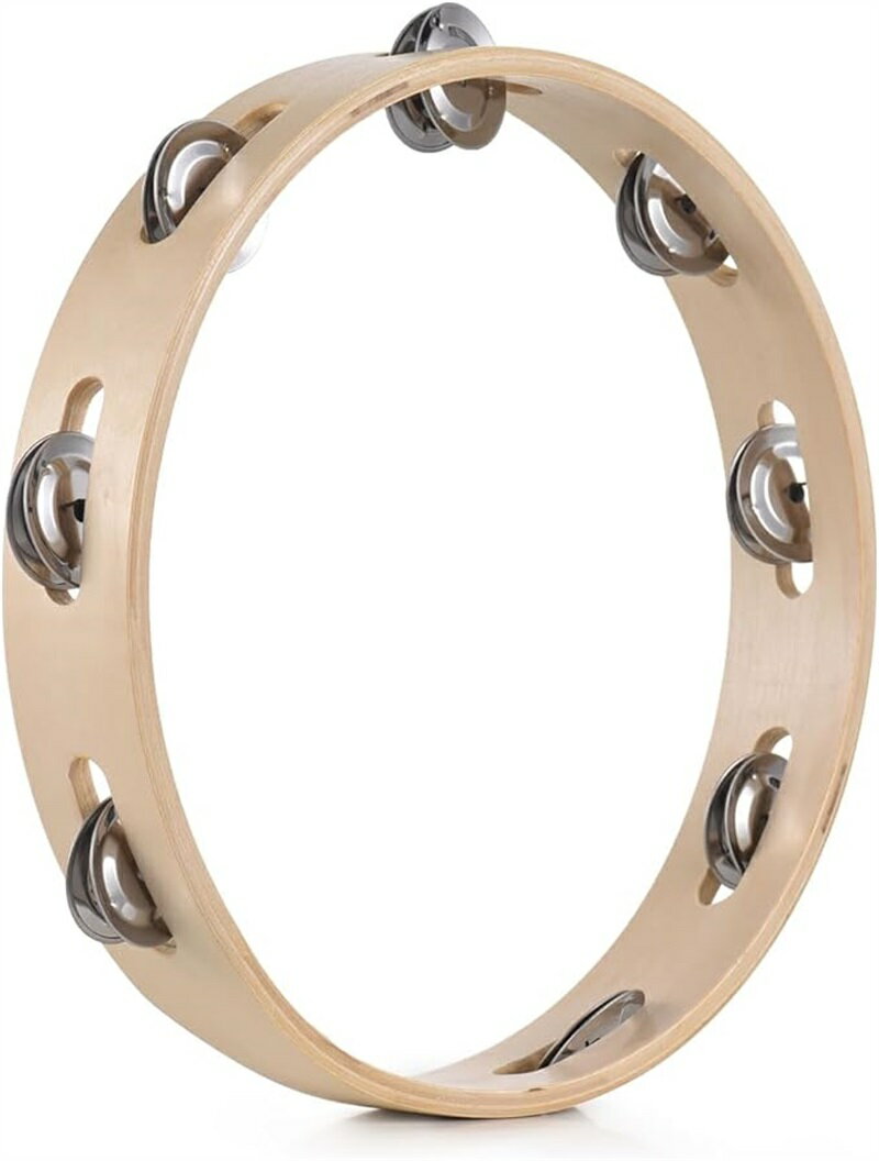 タンバリン、10インチ タンバリン 大人用 心地よいジングルサウンド 手回しベルリング 木製 ナチュラルカラー メタルベルサウンド 打楽器 家庭 学校 パーティー用品 単列 木製タンバリン