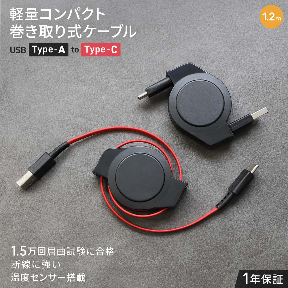 軽量 コンパクト 両引き 巻き取り式 USB Type-A to Type-C ケーブル 充電 データ転送 1.2m ブラック ブラック×レッド 1年保証 メール便送料無料 【Web限定モデル】