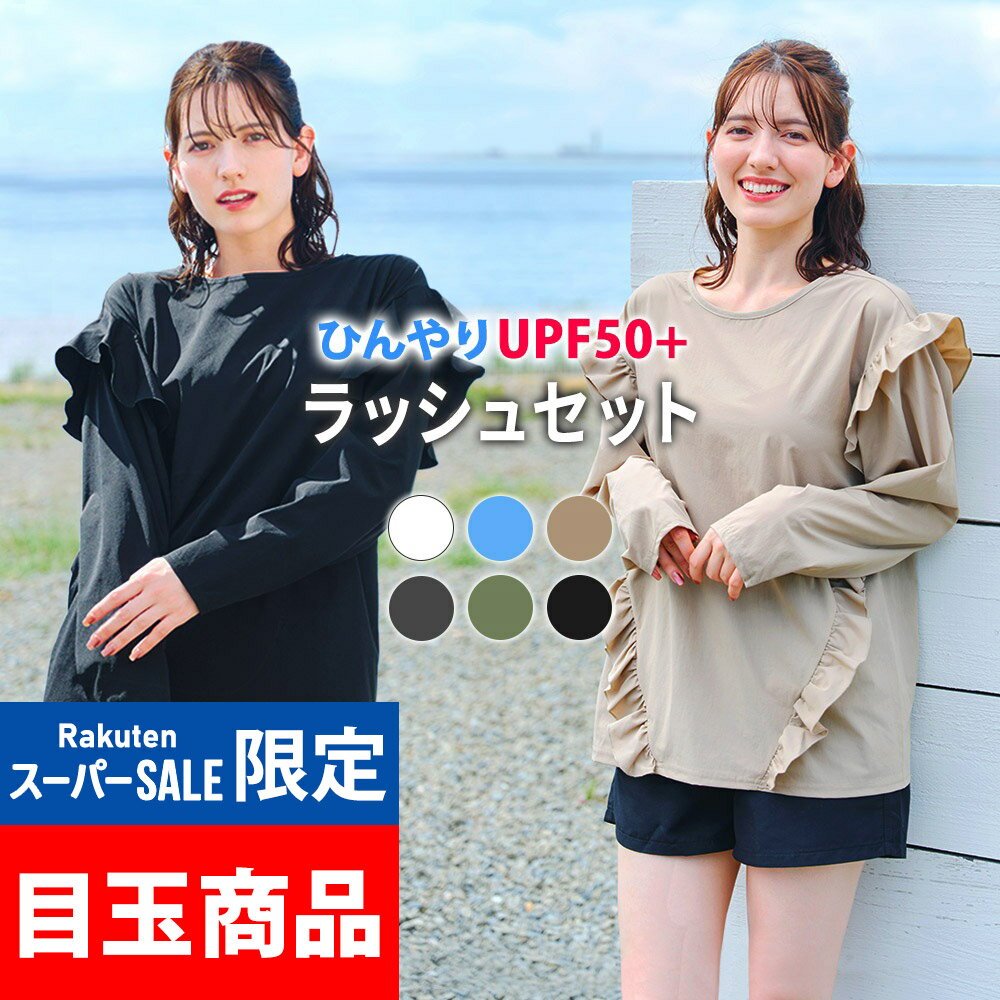【クーポン配布中】ラッシュガードセット ラッシュガード 水着 レディース フリルシャツ パンツ セットアップ S〜L UPF50+ 接触冷感 水陸両用 FELLOW 長袖 サーフパンツ 上下 UVカット 紫外線対策 日焼け対策 上下セット 24F-FFS